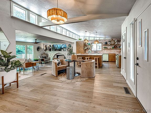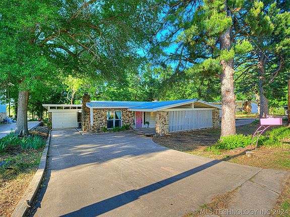 Welcome to your mid-century modern oasis with a touch of coastal Palm Beach charm! Enjoy the view of Lake Eufaula from the comfort of your living room. Located adjacent to corp land with direct access to the lake makes this a special home, and the cherry on top is the neighborhood boat ramp located next door. The playful use of pink and green hues throughout the home exudes a sense of fun and whimsy, creating a lively atmosphere perfect for entertaining family and friends. Imagine hosting gatherings in the stylishly appointed kitchen, cooking brunch on your retro mint green range while watching the kids play in the pool or catching views of the lake. With ample outdoor space for al fresco dining and recreation, this home is an entertainer's dream come true. Also, enjoy the convenience of a pool house including one of the full bathrooms and closet ready to use as a bedroom with easy access to the fabulous pool. Whether you're seeking a peaceful retreat to unwind or a vibrant backdrop for social gatherings, this one-of-a-kind lake house offers the best of both worlds. Come experience the perfect blend of mid-century charm and coastal flair – your oasis awaits! Bonus - Carlton Landing is only seven minutes away! Seller holds an active Oklahoma real estate license.