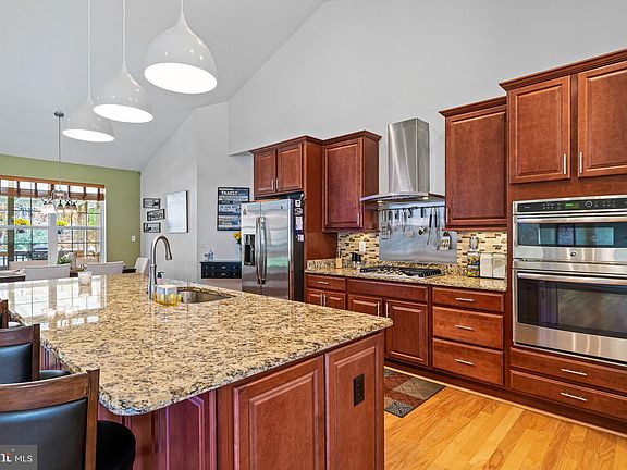 NEW CONDITIONS ADDED. SELLER WILL LEAVE THE 54" ZERO TURN LAWN MOWER WITH SNOW PLOW. (see video virtual tour in attached MLS) This custom stone front rambler sits high on a hill and at the end of the street (no traffic). Wonderful open plan floor plan with cathedral ceilings, hardwood floors and a warm soft feel. The kitchen is open to the main level which makes entertaining amazing. Custom Pellet stove and mantel over the fireplace. Kitchen has granite tops, stainless appliances, stainless backsplashes, gas cooktop and custom cabinets. Private yard and the back deck is perfect for fun (see the pictures). The master bedroom has 9' ceilings, a large walk in closet, custom bathroom with ceramic separate shower, large jetted soaking tub and double bowl sink/vanity. Full basement partially finished to complete almost 4500 square feet. full rough in bath. The insulated garage is the envy of folks that like to tinker, with epoxy floors and 9' garage doors which have additional track to give maximum headroom. Other highlights are: brand new roof, tankless hot water heater, irrigation system, 12'x20' storage shed.