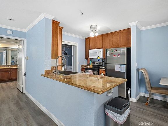 Welcome to this beautifully updated two-bedroom, two-bath condominium located in the desirable community of Corona Hills. Offering 1,063 square feet, this is the largest two-bedroom floor plan available in the community. Designed with comfort and style in mind, this home features an open-concept layout with luxury vinyl plank flooring throughout, complemented by upgraded baseboards, elegant crown molding, and a granite counters in the kitchen. The refreshed bathrooms add a modern touch, providing a move-in-ready experience. Each bedroom offers the luxury of a private balcony, perfect for relaxing, unwinding, and enjoying the fresh air. Additional highlights include a private garage, in-unit washer & dryer (included), along with ample guest parking within the gated community. Residents enjoy access to premium HOA amenities, including a fitness center, recreation facility/club house, a sparkling pool, and 2 spa areas. The HOA also covers water, trash, and natural gas, all reducing your monthly living expenses. Conveniently located near shopping (Costco, Home Depot, & Walmart), multiple dining choices, a city park on the adjacent property, minutes from Corona Metro train station, and 2 major freeways, this condo is ready to welcome you home and service all of your needs. Welcome home!