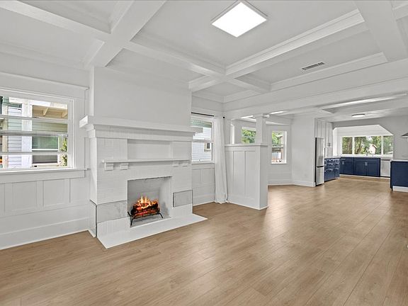 Mature treesWide plank floorsBold navy cabinetryCoffered ceilingNew stainless steel appliancesOriginal built-ins