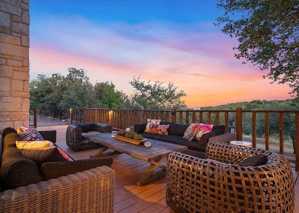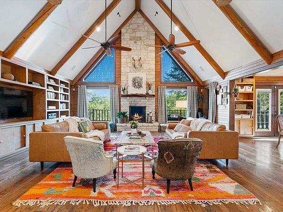 Welcome to Texas Hill Country living! No HOA, city taxes, or MUD! This 3-bedroom, 2.5-bath log home with the green metal roof sits on nearly 8 oak-filled acres with winding trails. It is completely fenced and gated for added privacy. From the wrap-around porch, step inside to find a sunlit, open-concept living room with a vaulted beamed ceiling, stone fireplace, and built-in bookshelves. The spacious kitchen flows into the dining area and out to a large deck overlooking the property, perfect for welcoming the day or enjoying the stars at night. The first-floor primary suite includes a bathroom with his-and-her closets, a clawfoot soaking tub, separate shower, and another set of French doors leading to the deck and garden views. Upstairs you'll find two spacious bedrooms at each end of an open hallway overlooking the living room, and an enclosed loft with vintage windows - the perfect office or art studio space. Back downstairs, a large laundry room with sink and extra storage makes a great mudroom after gardening or hiking through the woods. Outside, the rolling terrain makes the property feel even larger than it is, offering space to add on and still enjoy roaming the back woods. The huge barn features enormous sliding doors, a separate enclosed and air-conditioned office or studio, and lots of extra storage space. So many possibilities! Whether you want to utilize the existing animal structures and garden and start your own dream farm, or use the space to create a dream resort-style pool and cabana, this property is just waiting to be your private escape. Although it feels miles away from anything, you’re actually just 5 minutes from Lago Vista, 20 minutes from Cedar Park, and 40 minutes from downtown Austin. Access to Lake Travis is right in Jonestown.