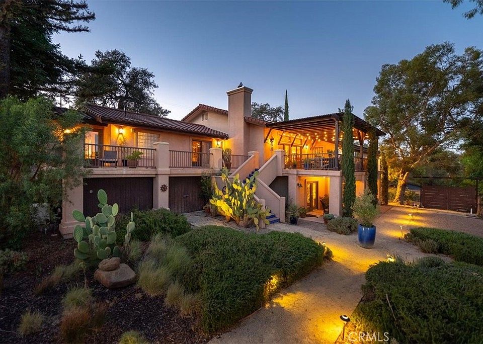 This extraordinary Mediterranean estate, set on a picturesque 5-acre parcel in the highly coveted Spanish Camp neighborhood of Paso Robles, offers two exceptional residences surrounded by mature oak and eucalyptus trees. Owned by a prolific cookbook author, both homes have been meticulously designed to meet the needs of discerning entertainers. The primary residence features a spacious 4-bedroom, 4,282 sq. ft. main residence that blends formal elegance with a warm, inviting atmosphere.