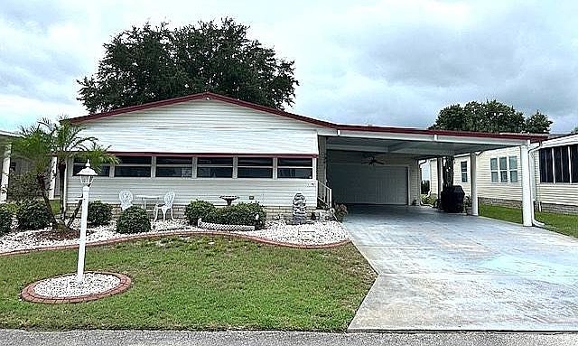 This beautifully maintained 1,600 sq. ft. furnished home offers comfort, convenience, and plenty of space. Featuring a large windowed lanai, an extra-large kitchen, and both a double garage and a covered carport, this property is ideal for entertaining or simply enjoying a relaxed lifestyle. Recent updates include a new AC unit (2021) and a roof just 5 years old. The kitchen and dining areas feature vinyl plank flooring, and the seller is offering a $2,000 flooring allowance to help you customize the rest of the home to your taste. Located in a desirable 55+ community, this home combines functionality with charm-ready for its next owner!