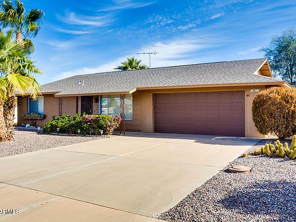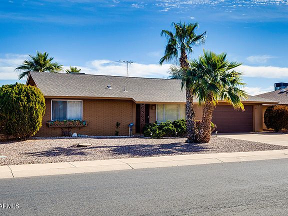Expanded Woodbury floor plan boasts 2 bedroom, 2 bath with large livingroom, indoor laundry and a 2 car garage. New HVAC 2025, New Roof 2021, Exterior Paint 2020. Home nearly complete and priced to accommodate buyers to paint interior, install new floors and add new appliances to complete this SCW desert gem in the rough. Large lot with rear covered patio and privacy trees for landscape. Great location just around the corner from Beardsley Rec Center.