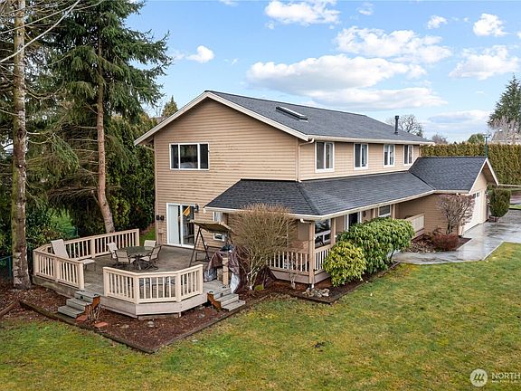 Charming cul-de-sac home on amenity-filled Tapps Island. Nestled on a spacious .43-acre lot, there's room to roam & enjoy the outdoors with sport court & Mt. Rainier views. New roof & welcoming front porch greet you. Inside, find 5 bedrooms + office on the main. Formal living & dining rooms provide easy access to the deck, offering add’l entertaining. The open & airy great room flows seamlessly into the kitchen & eating areas with wet bar. Updated baths add a modern touch, while the durable Hardi Plank siding and refreshed crawl space ensure long-term quality. A/C. Highly-rated Dieringer School District. Resort living includes private roads, security, pool, beaches, boat launch, tennis & pickleball courts, outer island nature trail +more!