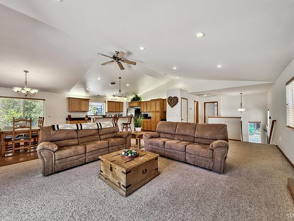 Welcome to this furnished home on a sunny and level lot in the heart of the Meyers community. The upstairs living boasts an open floor concept with vaulted ceilings, recessed lighting and large windows that offer plenty of natural light. The living area is perfect for entertaining guests with a cozy gas fireplace, half bath and sliding glass doors leading to a large deck. The kitchen/dining area features Oak cabinets, granite slab counters, gas stove, a built-in desk and laminate wood flooring. The spacious primary bedroom is complete with his and hers closets and an en-suite bathroom with a luxurious jetted tub, shower, and dual sink vanity. Downstairs are the two generously sized guest rooms, a full bath with shower/tub combo, laundry room and a family/game room. Enjoy the privacy of a fully fenced backyard with large deck and newer hot tub. Additional features include the oversized 2 car garage, metal bear box(trash receptacle), and RV/boat parking.