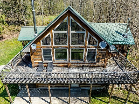 This is a nature lovers retreat you wont want to miss! Just minutes from Apsley, this 3-level chalet is nestled on a 286 acre lot featuring 2 expansive ponds, numerous trails, and abundant wildlife including bears, deer, and moose. The spacious 4 bed, 2 bath chalet boasts multiple open-concept living areas with stunning views through the floor to ceiling windows, a wrap around deck, three screened in rooms and an open loft. Need room for toys? The oversized two bay, heated, detached garage can fit just about anything you could need. Sleep soundly knowing this home comes with features like a metal roof, heated line to the well and backup generator. Pre-inspected for your convenience, take in the full scope of this property through the included drone footage.