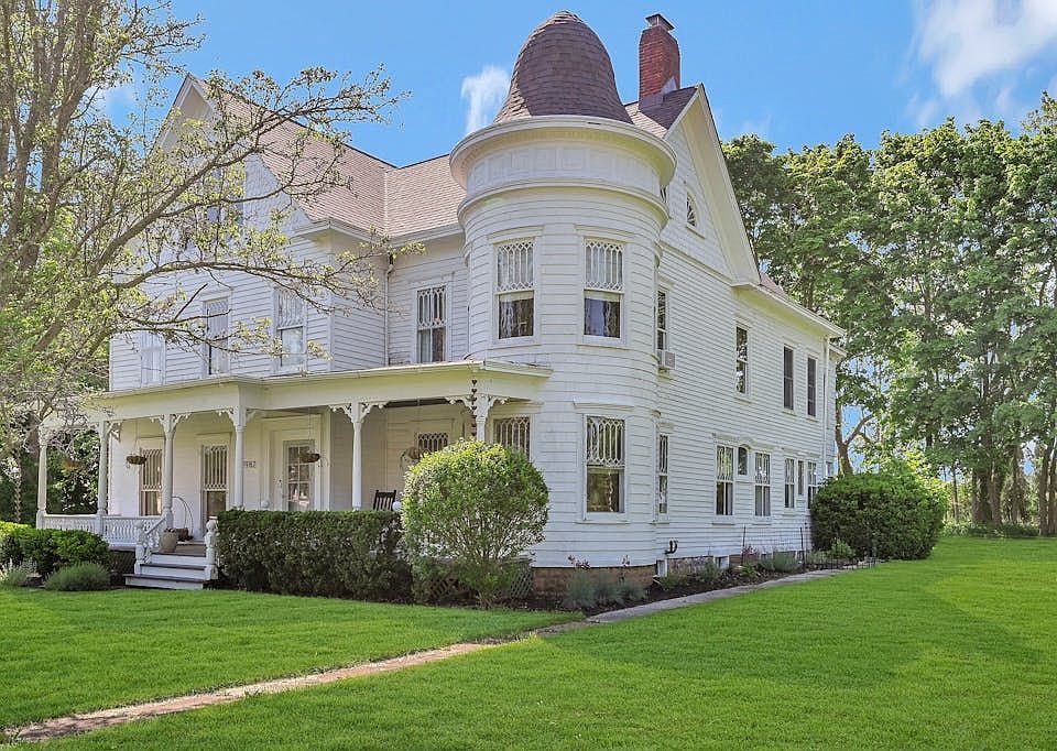 The picturesque Penny Homestead's distinctive Queen Anne Victorian-style mullioned windows and turret welcome visitors to Laurel. Lovingly renovated by a descendent of another original North Fork family, the home features spacious, high-ceilinged rooms with intricate maple and walnut inlaid floors, stained-glass windows, built ins and many other original architectural details. In addition to 3 bedrooms and 2 full baths in the main part of the home, there is a guest suite with a 4th bedroom and a second kitchen and bath for a total of 4 bedrooms, 3 baths and 2 kitchens! The main parlor with woodburning fireplace, and owner's bedroom take advantage of the tower element to add a fairytale-feel to these rooms. An additional parlor with gas fireplace, formal dining room, new kitchen with walk-in pantry, home office and charming sun porch complete living area. A full standup attic offers the opportunity for additional space. There is also a full basement with both inside and outside entrance. Beyond the spacious 1 acre yard with additional outbuilding, the home overlooks over 60 acres of forever farmland. More than just a house, the Penny Homestead is a timeless treasure, a truly original part of the North Fork's rich history. A classic antique home! And if you've ever dreamed of owning a B&B...this home would be perfect!