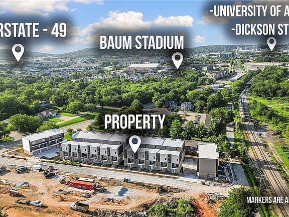 Down the street from U of A Diamond Hog Stadium. 30 units in multiple 4, 5, and 6-plex buildings. Eight 3BR, 3.5 BA and twenty-two 2BR, 2.5 BA, 3-story townhome/condo with contemporary, open floor design, ensuite bathrooms, quartz countertops, stainless steel, high-efficiency appliances, washer & dryer, programmable thermostats, cozy, electric living room fireplace, spacious tile showers with glass doors, garage door openers, luxury vinyl flooring-no carpet, upper-level tile flooring deck with iron railings. 30 dedicated parking spaces. Under Construction to be completed on or before June 2025. Horizontal property regime. Located in an opportunity zone.