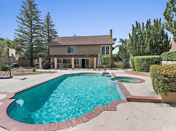 Stately brick staircase leads to 5 bedroom executive pool home that was featured on HGTV's "Color Correction." Tranquil backyard boasts a pool, spa, and covered patio. Almost 18,000 sq ft lot is large enough to hold a lifetime of memories. A gentle fountain is framed by the formal dining room window, allowing a peaceful dinner. Living room also affords a fireplace, vaulted ceiling, recessed lights & picturesque windows. The master suite also features vaulted ceilings, a sitting area, walk-in closet and a master bath with separate shower and spa tub. Upstairs are beautiful laminate wood floors. A second large bedroom that also has its own 3/4 bath could act as a second master suite or a work out room. Three other bedrooms are found on the second floor. The family room boasts a fireplace, as well as a wet bar and French doors leading out to the covered patio. The kitchen/breakfast area opens to the family room, making this an ideal open floor plan. Moreover, the kitchen includes a center island with a vegetable sink, refrigerator/freezer, microwave, four burner gas range and a double electric oven.