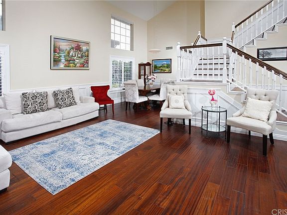 This beautiful home is nestled in one of the Valleys most prestigious gated communities, The Heights At Porter Ranch. Features: Lush landscaping, manicured shrubbery, and colorful planters. "Immaculate Interior Condition" with recessed lighting, plantation shutters, custom wainscotting, and a complementary blend of bamboo, hardwood, and stone flooring. Remodeled kitchen with elegant crown molding, abundant custom cabinets, pantry, granite counters with full tile back-splash, deep basin farmhouse sink, built-in stainless steel appliances which includes the refrigerator, center island with custom pendant lighting and built-in breakfast bar, plus the convenience of the very large adjoining formal dining room. Family room with its built-in surround sound, beautifully mantled fireplace, custom cabinets and shelving, and direct patio access. The huge master suite has a balcony with unobstructed panoramic views of the Valley below, a large walk-in closet, plus a sumptuously appointed bathroom with a large dual sink mirrored vanity, soaking tub, and glass enclosed shower. Large second story den/office with bay windows. Functionally located laundry room. Energy efficient dual pane windows. Dual zone central air & heat. Central vacuum. 3 car direct access garage. Backyard with brick inlayed patio and lush landscaping. You'll experience "Resort-Style-Living" enjoying the communitys sparkling pool, spa, tennis court, and park with childrens playground.