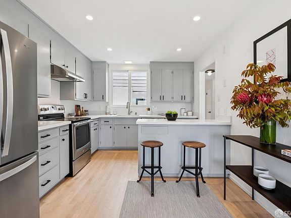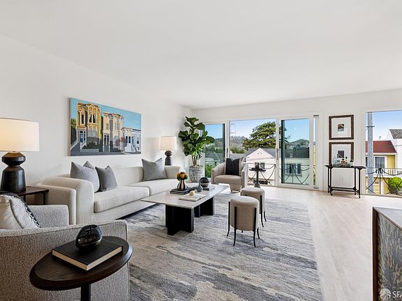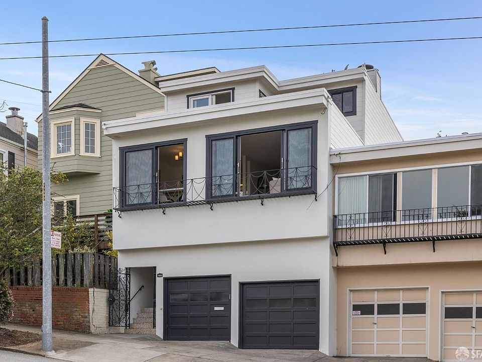 Welcome to 1983 10th Avenue, a stylish mid-century modern home in Golden Gate Heights with sweeping views of Mt. Sutro, Twin Peaks, the Bay, and the Golden Gate Bridge. Spanning ~1,740 sq ft across two levels, this bright single-family residence features 3 spacious bedrooms and 1.5 baths. The sun-drenched living room is anchored by a fireplace and picture windows, flowing seamlessly into a formal dining area and an updated kitchen with breakfast bar, new counters, and stainless appliances. Newly refinished hardwood floors, skylit staircase landing, and thoughtful updates throughout highlight the home's modern comfort and charm. Sliding doors extend living spaces to the outdoors, where a multi-tiered garden awaits with an oversized sun deck, stone patio, and faux-grass terrace. Upstairs, serene bedrooms enjoy city and garden outlooks, while the main level bedroom opens directly to the deck. A two-car garage, laundry room, and ample storage complete this inviting home. Perfectly situated near Golden Gate Park, neighborhood trails, and the vibrant dining and shopping of the Inner Sunset and West Portal.
