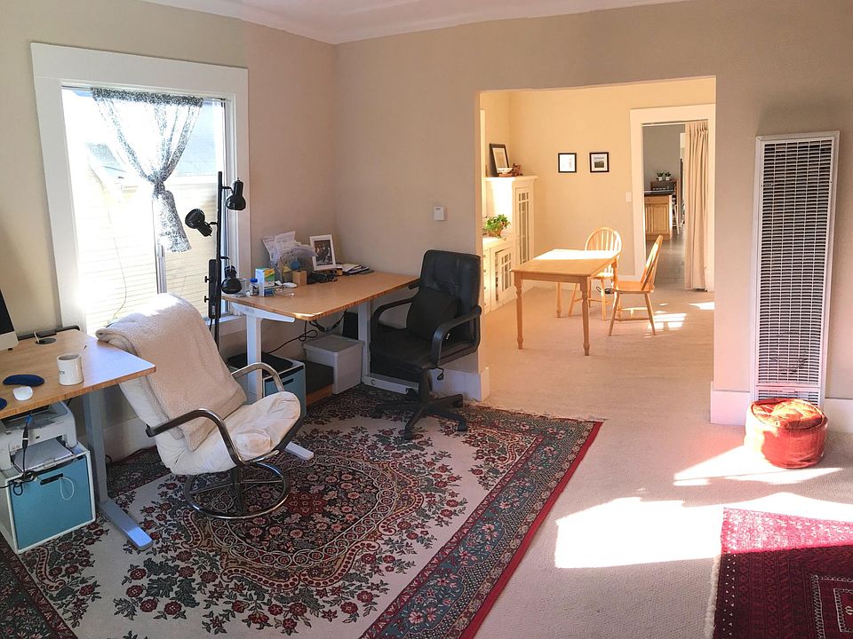 This sunny 3-bed, 2-bath house is charming and bright. The entire house was renovated just a few years ago, with a spacious updated kitchen and two updated bathrooms. The master bedroom is about ~120 sq ft, middle bedroom is ~100 sq ft, and the rear bedroom ~130 sq ft. There is in-unit laundry and private driveway (tandem) parking. The backyard is sunny and large, and comes with a set of outdoor furniture -- perfect for indoor/outdoor living and working from home. The house is a 15 min walk to Oakland Fruitvale BART, with many grocery stores and restaurants within a few blocks as well. Ignore any furniture you see in the photos -- this house is being rented UNFURNISHED.