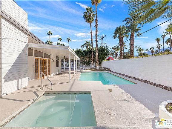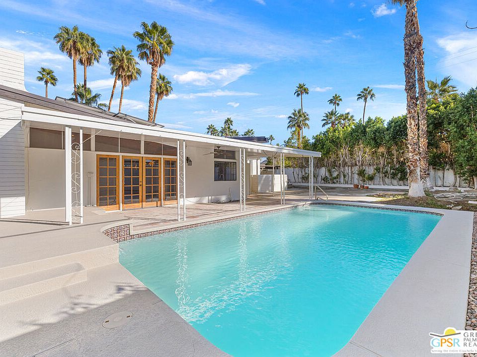 A true mid-century modern opportunity in one of South Palm Springs' most cherished architectural neighborhoods: Twin Palms. Built in 1958 by the famed Alexander Construction Company, this classic "Butterfly Alexander" showcases the iconic roofline, soaring vaulted ceilings, tongue-and-groove exposed beams, and clerestory windows that frame swaying palms and dramatic mountain silhouettes. Set on land you own (no land lease) and no HOA, the property offers tremendous architectural potential along with immediate lifestyle perks. The west-facing backyard captures the best of Palm Springs sun and scenery and features a freshly resurfaced pool and spa, updated equipment, and owned solar panels for year-round efficiency. Inside, the traditional mid-century floor plan includes a west-facing dining area and a living room with fireplace, an adjacent kitchen with backyard access and exterior views, and a classic bedroom layout that includes a Primary Ensuite plus two guest bedrooms with a nearby hall bath. The original footprint has been expanded to add a casual living space with a bar that opens to the backyard: a great foundation for indoor/outdoor entertaining. Move-in updates include new interior and exterior paint, a new water heater, and a new garage door. With its architectural pedigree and prime location, this is the ideal canvas for someone ready to bring a classic Butterfly Alexander forward into 2026. Even better: the property qualifies for a Vacation Rental Certificate, offering short-term rental possibilities for investors or part-time residents. This is a rare chance to restore, reimagine, and celebrate one of Palm Springs' most recognizable mid-century forms - all in a neighborhood beloved by enthusiasts from around the world.