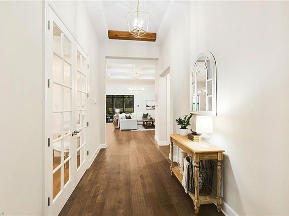 From the soaring 12' coffered ceilings to the engineered hardwood floors throughout, you're going to love your new Pulte "Creekview" from top to bottom! Your tray ceilings are adorned with real wood beams, making for a warm and inviting addition to the already light and airy home. Imagine the meals you can cook in your upgraded gourmet kitchen with built-in KitchenAid appliances, where family gathers around the expanded 9.5-foot center island. The finished pantry with built in floor to ceiling shelving, electric, and butcher block counters adds extra storage and convenience. Your primary suite at the back of the home offers the space and tranquility you need to unwind from the day. Your custom closet offers practical storage with quartz counter, built-in dresser, separate laundry bins, and plenty of shelving. The finished laundry room offers quartz counter, sink, and soft close cabinets. An extra storage closet can be used as a wine cave, small craft room, or butler's pantry. The three-car garage has added overhead storage as well. The separate office/den area is large enough to be a 5th bedroom. Each of the 4 bedrooms and separate office has newly installed plantation shutters and gets plenty of sunshine year around. Outside, your heated saltwater pool and spa is where you can relax among nature with your preserve view, privacy hedges and colorful bushes have been added for additional privacy. Additional features include: upgraded dimmable 5000k lighting and whole house water softener with reverse osmosis at kitchen sink. The Place at Corkscrew has something for everyone at every stage of life. You'll have world-class amenities such as a resort-style pool with waterslide, splash pad, a full-service restaurant and bar, bourbon bar, marketplace cafe, 2-story state of the art gym with childcare, fitness classes, on-site masseuse, playground, dog park, pickleball, tennis, and pro shop. Your new home is close to schools, shopping, beaches, and everything in between.