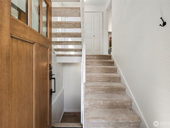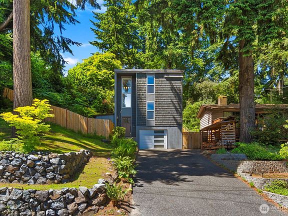 Stunning modern contemporary home situated in a picturesque wooded landscape. 3 bedrooms, 1.75 baths. Floating staircase, open concept living area with wood burning stove and vaulted ceilings. Large light filled windows. Remodeled kitchen with marble countertops, stainless steel appliances and custom cabinetry. Loft style primary bedroom with Juliette balcony, attached full bath with double vanities and walk in closet. Peaceful terraced backyard garden with pathway leading up to fire pit. Large attached garage and plenty of driveway parking. Welcome home to Shoreline.