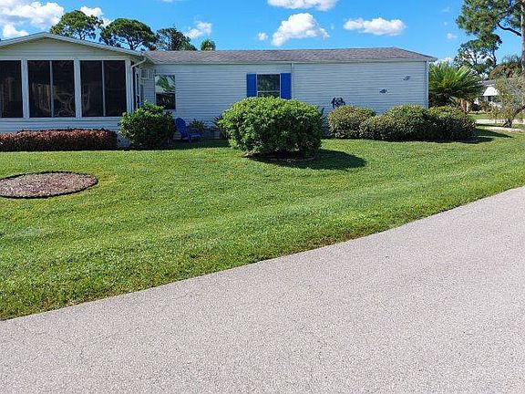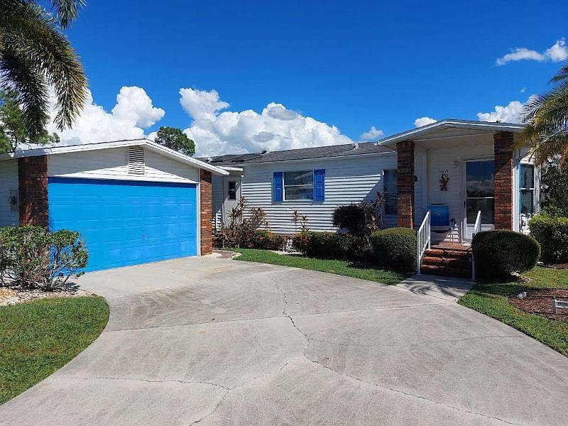 Beautiful Corner Lot partially furnished home with 2 bedrooms, 2 baths and a detached 1 1/2 car garage located on leased land in the Pine Lakes Country Club a 55+ age qualified gated community. This home offers a large living room open to the dining area and kitchen. From the living room you can access the enclosed lanai with large sliding windows along with a wall unit air conditioner to keep you cool while you sip your morning coffee or entertain friends. Throughout the home is vinyl flooring except for carpet in the lanai. The updated kitchen offers light wood cabinetry with two hall closets that can be used as a pantry or as utility storage. Walking down the hall is a laundry room with a desk workspace with cabinet storage for both laundry and the desk area. The guest bedroom is large, which will accommodate a king bed along with two closets for additional storage. The guest bath has a tub/shower combo right across the hall. At the end of the hall is the primary bedroom with ensuite bath that has a walk-in shower. The primary bedroom includes two closets. UPDATES: A/C 2007, Roof 2016 There is a golf cart available for purchase, just ask! Start enjoying this great community with lots of amenities, clubs, entertainment and even a restaurant to grab a bit to eat or a beverage after playing a round of golf.