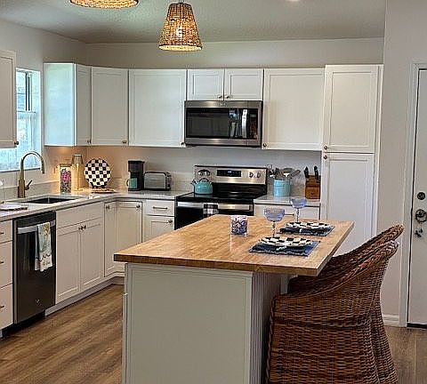 Newly renovated, All NEW: AC, floors, kitchen cabinets and fixtures, quartz and butcher block counters, bath vanities, bath fixtures, commodes, light fixtures, paint, gutters, garage floor epoxy and more!