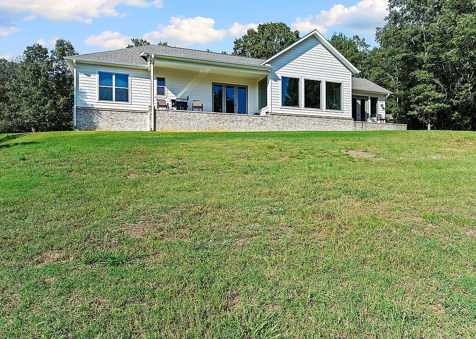 Set on 5 acres, this 1-story 2022 build blends everyday comfort w/ sophisticated design. Featuring 3 beds, 2.5 baths & an office, the thoughtful split floor plan balances open-concept living w/privacy, while an oversized entryway welcomes you into the sun-filled living spaces. Large windows throughout flood the home w/ natural light, accentuating the modern finishes. At the heart of the home is the kitchen, complete w/ a 10' island w/ bar seating, walk-in pantry, SS appliances & a 6-burner gas cooktop. A dry bar enhances the dining area, while french doors open to a covered patio, perfect for entertaining. The living room features vaulted ceilings, a gas fireplace & a custom oak mantle. The primary suite is a true retreat w/ a private patio. The ensuite bath features a soaking tub, walk-in shower, dual vanity, & generous walk-in closet. With private lake access & a sandbar, 2 patios for year-round enjoyment of breathtaking views, this home perfectly blends luxury and functionality in a serene lakeside setting.