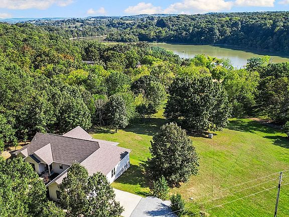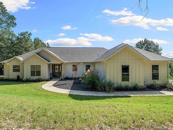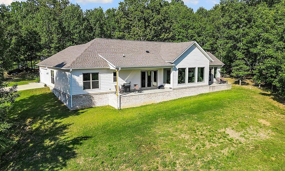 Set on 5 acres, this 1-story 2022 build blends everyday comfort w/ sophisticated design. Featuring 3 beds, 2.5 baths & an office, the thoughtful split floor plan balances open-concept living w/ privacy, while an oversized entryway welcomes you into the sun-filled living spaces. Large windows throughout flood the home w/ natural light, accentuating the modern finishes. At the heart of the home is the kitchen, complete w/ a 10’ island w/ bar seating, walk-in pantry, SS appliances & a 6-burner gas cooktop. A dry bar enhances the dining area, while french doors open to a covered patio, perfect for entertaining. The living room features vaulted ceilings, a gas fireplace & a custom oak mantle. The primary suite is a true retreat w/ a private patio. The ensuite bath features a soaking tub, walk-in shower, dual vanity, & generous walk-in closet. With private lake access & a sandbar, 2 patios for year-round enjoyment of breathtaking views, this home perfectly blends luxury and functionality in a serene lakeside setting.