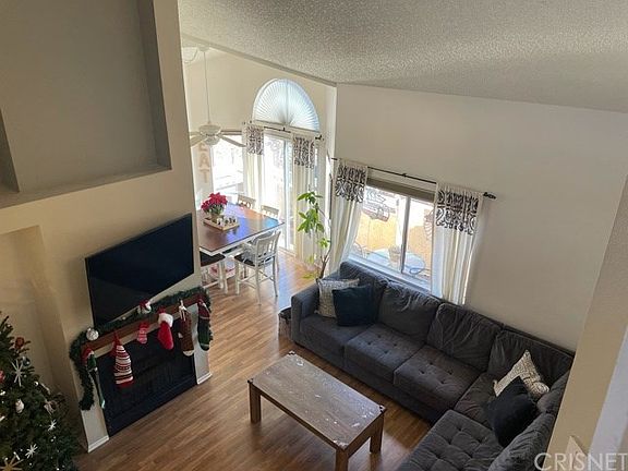 Newhall top level condo with 3 bed, 2 bath, a loft, indoor washer & dryer, and wrap around balcony with views! Spacious high vaulted ceilings, recessed lighting, fireplace in living room. It also has a 2-car side by side garage. No tandem parking like other units here. Master private suite has its own private bath with large shower. Private upstairs loft has wetbar sink and can be a great office space, 4th bedroom or entertainment room. Washer, dryer, stove, refrigerator and microwave included. One of few end units with wrap around balcony and pool views. Hoa includes water, trash, grounds maintenance, insurance, pool and clubhouse.