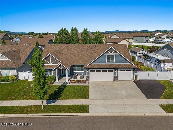 Awesome single level Post Falls home with heated 20x30 shop. Welcome to the model home in Viking Estates. Super design in this 2,750 SqFt 4 bed, 2.5 bath Rancher. Pride of ownership abounds in this one owner home. Amenities include: open concept, split BR design with home office plus a bonus room. 3 car garage with shop that is insulated and heated, covered patio with motorized shades gives you total sun/shade control. Professionally landscaped, water feature, fire pit and fences for privacy. As a bonus there are multi colored permnent holiday lights on the front of the home. This home is truly a must see in Post Falls!