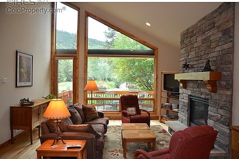 MONDAY 8/15 noon deadine for all ofers. This beautiful riverfront luxury condo has high-quality craftsmanship. Gigantic windows take full advantage of the great outdoors. Experience the Big Thompson River in your backyard as the river bends gracefully past your field of view. High-end finishes include alder cabinetry, granite counter tops, impressive gas fireplace, hardwood floors, spacious loft, and an open floor plan. Expanded rock patio plus deck surrounded by trees.