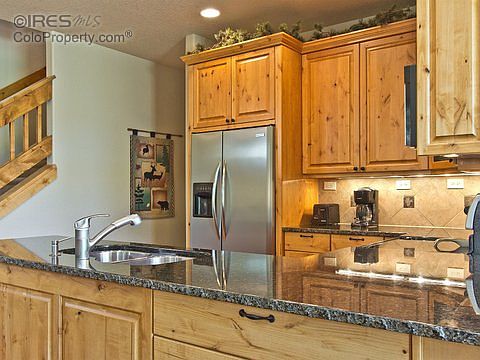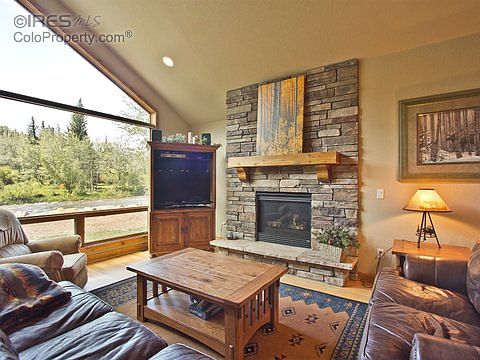 This elegant condo has unbelievable rare views of Longs Peak and the Big Thompson River. Offering luxury finishes throughout with an open floor plan, vaulted ceilings, wood floors and wood accents throughout. Impressive stone fireplace in the living room and a wall of windows look out to the river. Kitchen features granite counters, a breakfast bar and deluxe cabinetry. Spend time relaxing on the deck underneath a retractable awning. Beautiful landscaping on the grounds.