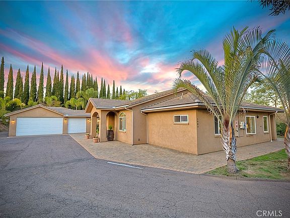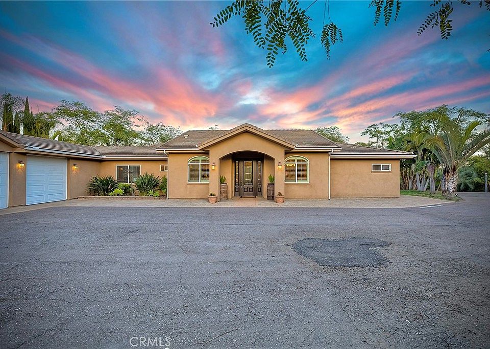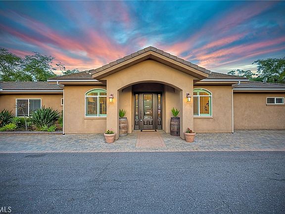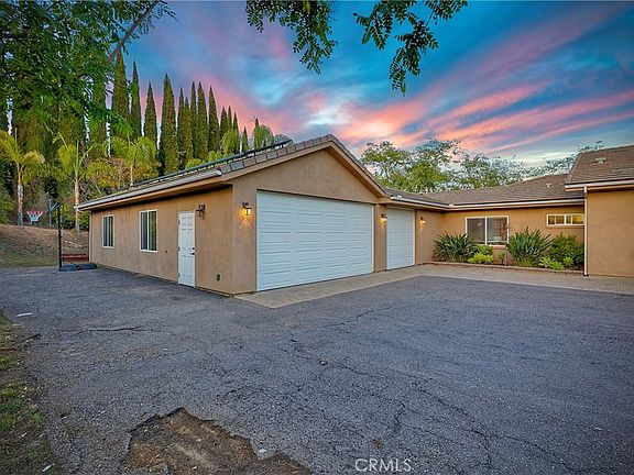 Discover this stunning single-level custom home, beautifully built in 2014 and offering over 3,200 square feet of seamless, modern living on a spacious, fully fenced and gated 1+ acre lot with breathtaking east-facing mountain and valley views. Perfect for families, car enthusiasts, or those seeking versatility with dedicated RV parking and ADU potential, this turnkey gem features no stairs and effortless elegance throughout, plus energy-efficient solar power at an affordable $170 per month. At the heart of the home lies a giant open-concept great room that effortlessly combines the dining area, newly remodeled gourmet kitchen with sleek cabinetry and premium appliances, and cozy family room, all accented by luxurious white vinyl plank flooring and extra-tall ceilings and doorways that flood the space with natural light and an airy grandeur. Tucked away on one side for ultimate privacy, the primary bedroom opens via slider door to the covered paver patio, complete with a spacious walk-in closet and custom luxury shower in the en-suite bath. Down the hall, three additional bedrooms provide flexible space for family, guests, or a home office, alongside a convenient built-in laundry center. Car lovers will appreciate the oversized 5-car garage with ample room for vehicles, a boat, trailer, or workshop, while the property boasts three separate entrances perfect for ADU additions and enhanced privacy—the upper lot with its own gated entrance ideal for RV parking, and the lower lot with a dedicated entrance ready for ADU development. Relax and unwind on the covered paver patio, framing panoramic vistas of the mountains and valley below. Don't miss this rare opportunity—schedule your showing today!