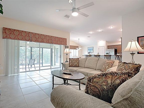 This 2-bedroom, 2-bathroom Designer Home is in the Village of Pennecamp, 8 minutes from Lake Sumter Landing and 3 minutes from Cane Garden Country Club. The open layout includes slide-away glass doors to the enclosed lanai. The home has two queen beds one in the master bedroom with an ensuite Roman walk-in shower, and one in the guest bedroom, located next to a bathroom with a tub/shower combo. The kitchen has stainless steel appliances and seating at the countertop, dining room, or lanai. Bonita Pass and Tarpon Boil Executive Golf Courses are 3 minutes away; Southern Star is 5 minutes. Poinciana Pool is 2 minutes away; SeaBreeze Pool & Rec Center is 4 minutes. July-October monthly $ 2700 plus taxes & fees--November $3335 plus taxes & fees--December $3600 plus taxes & fees--PLEASE CALL FOR PEAK SEASON(JAN-MAR) & WEEKLY RATES