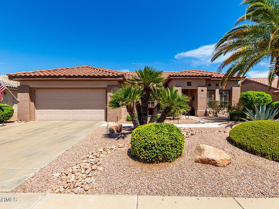 Experience refined living in Sun City Grand with this updated Jasmine model! Featuring 2 bedrooms (each with en0suite) + den, this home shines with plantation shutters, designer lighting, and wood-look floors. The gourmet kitchen boasts stainless steel appliances, granite counters, white cabinetry w/ two-tone island, and a spacious island perfect for entertaining. The serene primary suite offers a bay window and spa-like bath with dual sinks and sleek shower. Outside, enjoy a private fenced yard with covered patio and tranquil sitting area. A true gem in an active adult community! - SO many amenities to enjoy -4 golf courses, pools, tennis & pickle ball, exercise facility & SO much more!