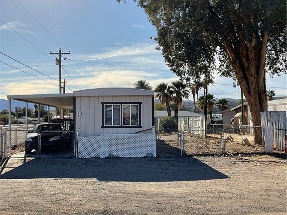 Charming! Clean property on a Corner lot. Pull into a fully fenced double-gated driveway with an Extra Long Metal Carport with a Large Covered Patio/Deck for entertaining and relaxation on one side. The other side features a Full-Size RV parking and hookups, Plenty of space for Your toys, and the Storage Shed/utility room with a Newer Full-Size water Heater and Stackable Washer and dryer that Stays! Inside, you'll find 2 bedrooms and 2 bathrooms, an Open Concept Living/Dining area with lots of natural light, and a handy secondary entrance on the side. This property offers a fantastic opportunity with a little TLC to transform a Diamond in the rough into a Rental income, Vacation, or Dream home. It is conveniently located near the Colorado River, Boat Launching, Shopping, Dining, and Laughlin Night Life. Buyer to verify all pertinent information including but not limited to flood plains, utilities, square footage, etc.