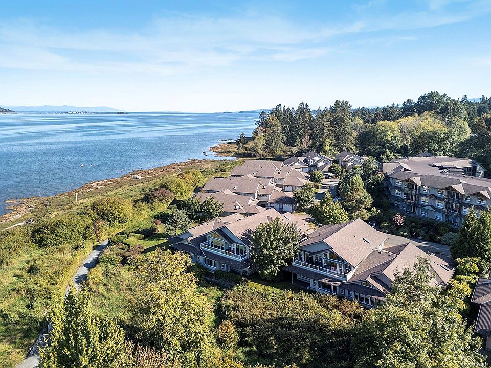 Ocean front and ocean views! Single level patio home in one of the most desirable complexes in Courtenay. With direct access to the Courtenay Riverway Walk, enjoy nature at your doorstep and the ever changing views from your living room and front row patio. Adjacent to greenspace - this is one of the most private units in the complex. Inside you'll find a bright and modern semi-open living space graced with warm in-floor heated hardwood throughout, a deluxe kitchen with stainless steel appliances, and picture windows framing the views. Each of the two bedrooms has a large ensuite, plus the den makes an amazing craft space or home office. Easy access with parking at your front door plus a single garage for the second car and storage. The complex is built with quality materials and meticulously maintained, ensuring peace of mind while you enjoy the lifestyle you deserve. Just minutes from downtown Courtenay and shopping. Come and join the friendly 55+ community at Crystal Shores.