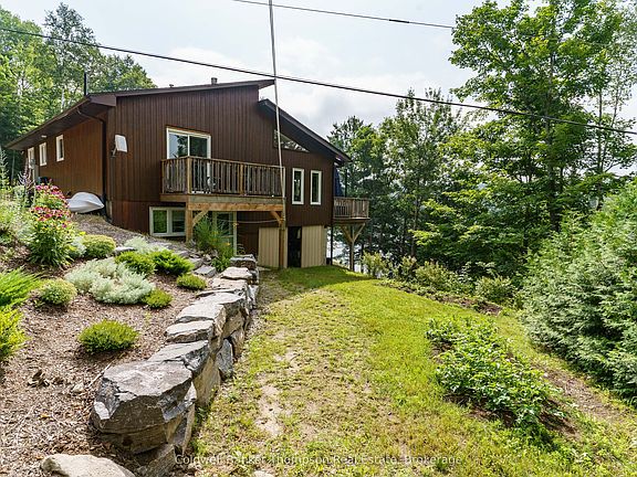Year round living enjoyment in this parklike setting, 190 feet of natural canadian shield deep water shoreline. Southern exposure. Lift dock. Home was extensively updated in 2013, custom kitchen to please the chef in the family. Enjoy the open concept living are, hardwood floors, propane fireplace in sunken living room, and walkout to huge entertainment deck overlooking Doe Lake. Primary bedroom has his and her closets and private deck. Custom bath and 2 additional bedrooms on main level. Fully finished lower level, additional bath, laundry room, recreation room and 2nd propane fireplace. Generac and central air. NEW furnace in fall of 2024. Plans for 2025 include new back splash for kitchen, and railing on walkway to the lake.