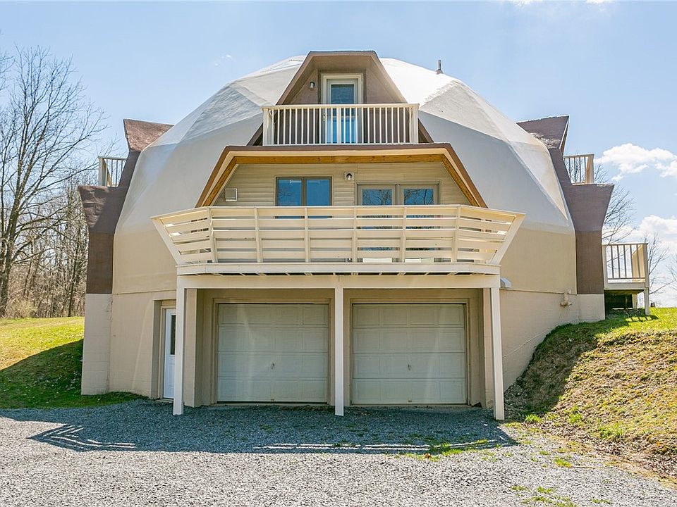 Welcome to The Dome. Now presenting a rare opportunity sought by those whom perceive normal as insufficient. This truly contemporary Geodesic home sits on 5 full acres including an active stream, pond, and apple orchard. Light dances through the homes multiple skylights into each of its 5 Bedrooms and living area. Soaring ceilings, chic finishes, abundant space. The property has been modernized and updated from basement, to top floor balconies. Featuring a sun soaked chefs kitchen and deck for enjoying summer meals. 1st floor master suite and bathroom with optional laundry area. Each bedroom on the lofted 2nd floor offers a private balcony with differing views of the property. The basement is finished with epoxy floors, 2 car garage, storage room, and plenty of space for final touches. Updated utilities offering worry free occupancy include, Furnace & A/C (2016), Hot Water (2016), Well Pump (2015), Full Water Purification System (2016), & Whole House Air to Air Exchanger. A truly wonderful opportunity presents for those looking to occupy, or utilize the unique experience for short term rentals.