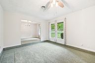 Inviting front porch patioMature treesCozy family roomCovered patio roomFour-seasons roomBrick fireplaceDining area