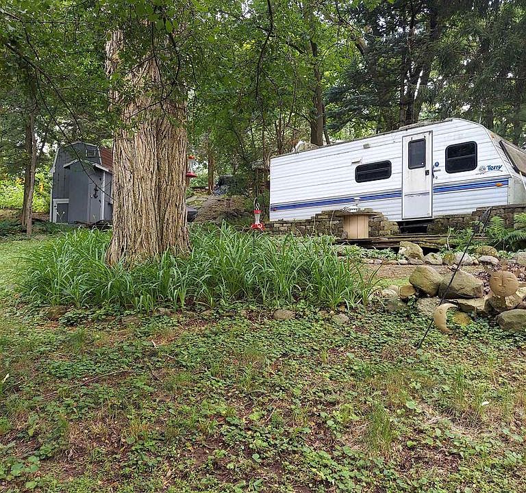 Hidden lot in Rock River Leisure Estates Vacation Resort. Your fun getaway. Wooded lot with shed, travel trailer, as is. Resort offers two pools, country store, pickleball, tennis, basketball and more. Fun events, pavilion for rent. No permanent living.