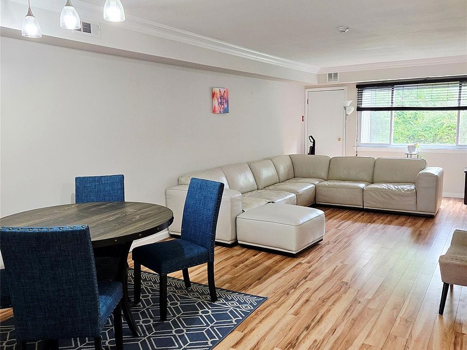 This main-floor 2-bedroom Co-Op features new windows, crown molding, upgraded panel doors, new carpeting, and fresh paint. The spacious layout includes an eat-in kitchen, open living/dining area, and 1.5 baths — including a private half bath in the primary bedroom. A welcoming entry path leads directly to your front door, with parking just a few steps away.