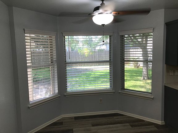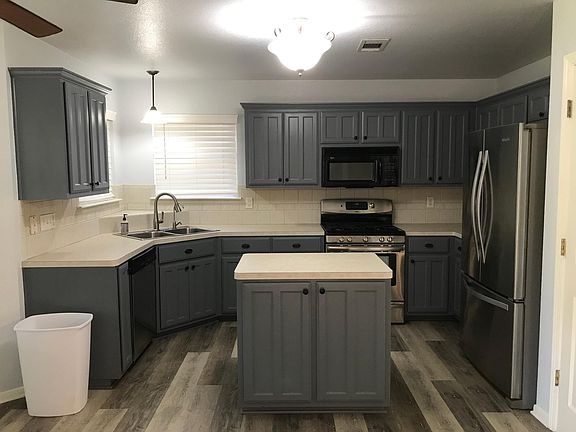 Super nice white stone home with large trees front and back, private backyard and covered patio. Family room has high ceilings and built-in cabinets. Masterbath has jetted tub and separate shower, and his and her closets, and 2 lavatories., Kitchen has lots of cabinets, and island, gas range and microwave. Includes a refrigerator, washer, dryer and water softener. Two small pets are permitted. No smoking.