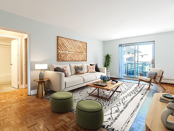 One-, two-, and three-bedroom apartments feature large closets, private balconies, heat included, in-building laundry, indoor and outdoor parking, elevator access, and storage space.