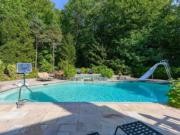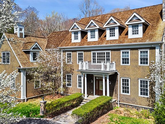 Stately Shingle Colonial. Impressive and beautifully finished interior with high ceilings, beautiful hardwoods, substantial moldings and two fireplaces. Two-Story Entrance Hall. Formal Living and Dining Rooms for elegant entertaining. Chef’s Kitchen with center island and breakfast area open to spacious Family Room. Library/Office perfect for working remotely. Private Primary Suite with two Walk-in Closets and spacious Bath. Four additional Bedrooms plus Second Floor Bonus Room. Lower Level Recreation Room and Gym offers an additional 2200+ square feet. Large deck overlooking the striking pool with two waterfalls, kiddie pool and spa. Summer Kitchen with built-in barbecue, fireplace and dining terrace for an ideal outdoor lifestyle. Almost five private, fenced acres at the end of a quiet cul-de-sac next to the protected Zofnass Preserve. Gorgeous gardens, large expanse of lawn and scenic woodlands. A spectacular offering!