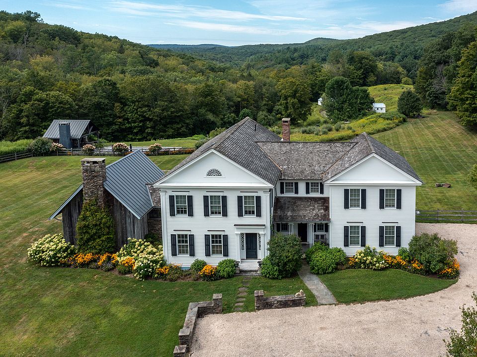 Designer's Country Retreat on 19+/- Acres with Pool, Pond & Glamping! Meticulously designed by a noted interior designer as her personal countryside sanctuary, this extraordinary residence offers refined living amid the enticing natural beauty of Litchfield County. Located on the Morris/Washington border, the property enjoys quick access to the sought-after villages of Washington Depot, New Preston, Bantam, & Litchfield. From the striking Greek Revival exterior to the warm, welcoming interiors, every detail of this home has been thoughtfully curated. The gourmet kitchen, ideal for entertaining, flows seamlessly into a cozy family room & casual dining area. A butler's pantry connects to the formal dining room, while a sunlit hallway leads to the living room with vaulted ceiling. Its a truly inspiring space to relax, take in the view through the huge picture window, or gather with guests. Upstairs, 5 bedrooms and 4 full baths open onto a screened sleeping porch, perfect for summer nights or reading al fresco. The finished attic adds flexibility with a bunk room hosting 6 twin beds and a half bath. The home comfortably sleeps 16. The lower level offers a fun game room for year-round enjoyment with a 3rd stone fireplace and addl 1/2 bath. Throughout the home, timeless materials such as hand-hewn beams, wide board floors, fieldstone fireplaces, and Shaker-style cabinetry create a sophisticated yet rustic ambience. Outside, expansive views, cottage-style gardens, and a broad, flat lawn extend from the covered porch and terrace. Meander down to the stunning gunite pool with its post-and-beam cabana with kitchenette, bath, built in grill station, and outdoor shower. Continue on mowed paths to the lily pad-covered pond. 4 rustic cabins with built-in bunks provide a magical "glamping" experience around a stone firepit overlooking the pond. Walk to the Bantam River for fishing. Bantam Lake is just a short drive away for boating and beach access. This rare offering combines the charm of a classic country estate with the comfort and scale of a modern home. Potential for equestrian use with an antique barn on site. Featured in New England Home Magazine.