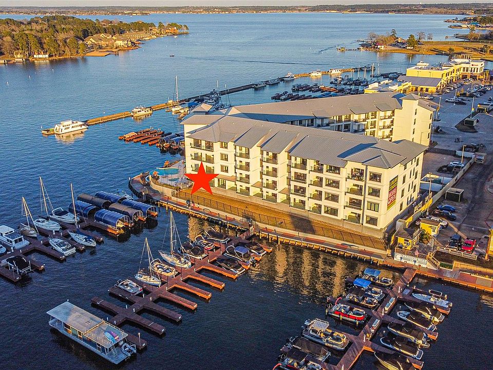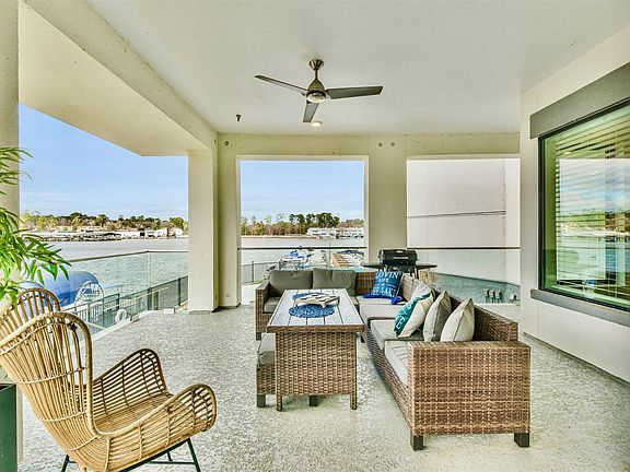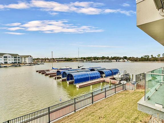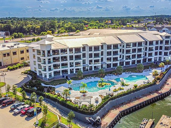 Luxury condo professionally decorated w/180 view of the lake overlooks both pools and has the best sunset view of the entire building. Floor to ceiling sliding glass doors extend living space into huge outdoor balcony with lake views.NEW Remote controlled motorized outdoor shades for the entire balcony to add privacy but also extends the use of the outdoor living space year round. Luxurious and spacious condo w/high ceilings, LED under & above cabinet lighting, must see flooring & gorgeous bathrooms. Resort amenities include 2 stunning pools (sunrise w/waterfall, bridge, water features & sunset w/infinity edge towards lake), hot tub, grilling stations, green "egg" smoker, fire pits, lush tropical landscaping, private gated entry, 2 elevators, PELLA windows, Bosch appliances (refrigerator & washer dryer stay). Step through gate connects you to half mile boardwalk & the best restaurants/retail center in Lake Conroe. Condo has SmartLock door for security and ease--never lock yourself out.
