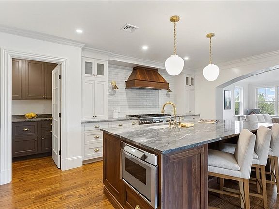 199 Winchester Street is a multigenerational home featuring 4-bedrooms, 3.5-bathrooms, den/playroom and private fenced yard. The gourmet kitchen boasts a 9' island, 48” gas/electric range, 42” paneled refrigerator and a pantry with sink. The first floor includes a 400 sq ft living room with gas fireplace, Open Kitchen and Dining room, Primary suite with working wood fireplace and steam shower, 2 guest bedrooms with shared full bath and laundry room with storage and sink. The lower level includes a mudroom with direct access to the garage and 2 storage closets, family room with wet bar, guest bedroom and full bathroom. The lower level is ready to be used as an in-law suite. Enjoy outdoor living with the exclusive and private rear yard with treetop views of Brookline, the welcoming covered front porch and balcony off the dining room with gas connection for BBQ. This custom curated and meticulously designed home offers the perfect balance of Location, Quality and Price.