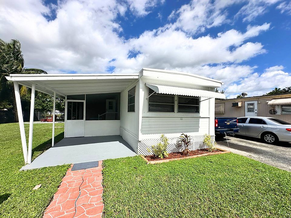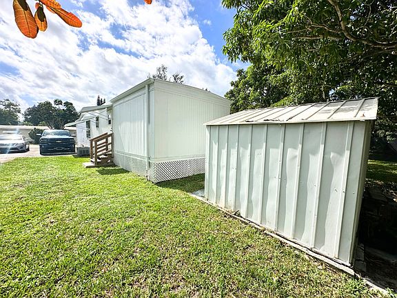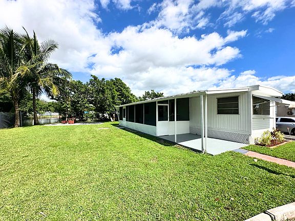 Located in Riviera Park, an all-ages community in Miami Gardens, this charming corner-lot home offers lush greenery and mature fruit trees including mango, avocado, and banana. Enjoy the end-of-street quietness with no direct neighbors, a large yard, and a peaceful view of a nearby body of water. The open living and kitchen area is bright and inviting, featuring plentiful windows, ample counter space, and generous storage. Outside, relax on the screened-in patio, make use of the storage shed, and enjoy the spacious backyard with room for two-vehicle parking. Conveniently situated near major highways, shopping, and dining, this home combines privacy, nature, and accessibility. Land lease $980/month. Some seller financing available. Se habla español. Call today to schedule your private tour.