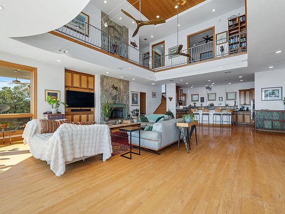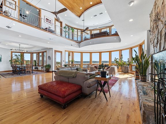 Stone fireplacePrivate boat dockHardwood floorsOpen-concept floorplanRounded wall of windowsElevated perchTerrace access