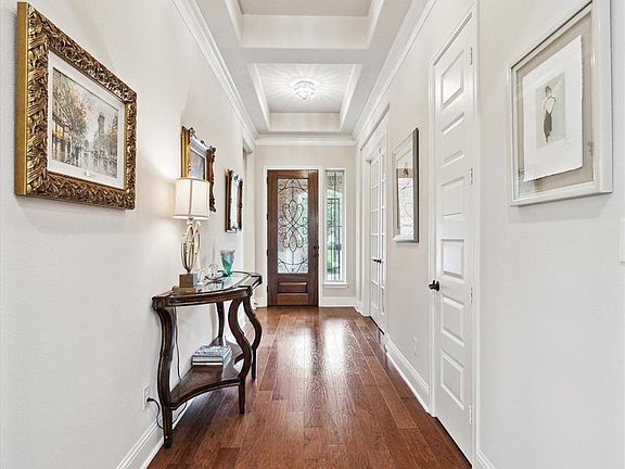 Gorgeous Spanish-Style Patio Home offers elegant indoor and outdoor living spaces. Enter through a charming iron gate into a private courtyard that leads you to a breathtaking entryway. Inside, the open-concept floor plan features a spacious family room with fireplace. Wood floors and designer lighting add to the home's upscale ambiance. The kitchen is complete with stainless steel appliances, granite countertops, double ovens, abundant cabinet storage, and an oversized island. Study has double French doors and custom built-ins. The primary ensuite boasts high ceilings, custom moldings, sitting area, with a two-person walk-in shower and bench, jetted soaking tub, dual vanities, and an oversized walk-in closet. Spacious 2nd and 3rd bedrooms offer ensuite to private bathrooms with showers. Private backyard features an extended covered patio with a fireplace and outdoor kitchen. Home also has plantation shutters, wood blinds, carpeted bedrooms, full sprinkler system, and spacious garage.