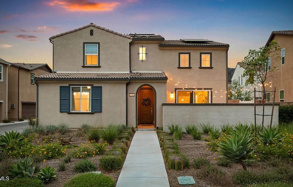 Welcome to this beautifully upgraded 2021 home in the desirable Harvest at Limoneira community. Designed with modern living in mind, this flexible floor plan offers 3 bedrooms, a spacious loft, and 3 full bathrooms, including a convenient oversized downstairs bedroom with an adjacent full bath.Step inside to find thoughtful upgrades throughout: Cali Vinyl longboard flooring downstairs and in all bedrooms, fresh Berber carpet on the stairs and loft, and custom Bali Roman blackout shades. The gourmet kitchen boasts a striking Italian tile backsplash, stainless steel appliances, an oversized island with bar seating, and an owned reverse osmosis system.The inviting living room features an added electric fireplace for warmth and ambiance, while the upstairs offers a dedicated laundry room, generous loft, and a large primary suite with a walk-in closet. Every bedroom enjoys its own walk-in closet for exceptional storage.Outdoor living is just as impressive with a patio yard featuring pet-friendly turf, river rock accents, and tropical landscaping--perfect for low-maintenance enjoyment. The garage is fully optimized with slat wall storage and overhead racks, making organization effortless.Additional highlights include leased solar for energy efficiency and stylish upgrades throughout. Best of all, the Harvest at Limoneira community offers resort-style living with a pool, spa, kiddie pool, full gym and yoga room, community garden, multiple playgrounds, parks, and scenic walking paths. Additionally there is a large farmhouse and multiple locations for residents to enjoy for party rentals. This move-in ready home blends style, function, and comfort--offering the perfect balance of indoor and outdoor California living.