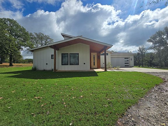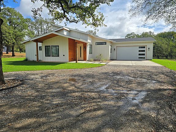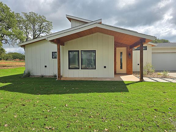Nestled among towering trees on a serene 1.79-acre lot, this 2,200 square ft mid-century modern, Hayhurst Brothers crafted home seamlessly blends timeless design with modern comfort. Showcasing a signature butterfly roof and clean architectural lines, this 3-bedroom, 2-bath home offers style, functionality, and room to breathe. Step inside to an open floorplan featuring vaulted ceilings, expansive windows, and bright, airy spaces that bring the outdoors in. The spacious living and dining areas flow effortlessly, perfect for entertaining or enjoying peaceful evenings at home. Each room is filled with natural light, highlighting the thoughtful design and warm ambiance throughout. The home also includes a 2-car garage and sits tucked away in a quiet, country setting—while still just minutes from city conveniences. This is where modern architecture meets tranquil Texas living. Estimated completion date Early September 2025. Hurry out to see this one of a kind home before it's gone!