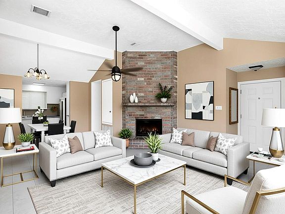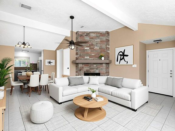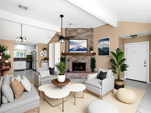 Wood burning fireplaceStainless steel refrigeratorOpen concept floor planAmple lightingDining areaCountertop microwaveCozy kitchen